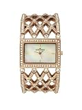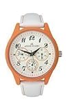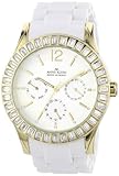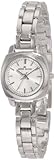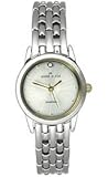 Dress watch, Japanese quartz movement, Polished gold-tone sword hands and sweep seconds, Genuine diamond hour marker at twelve o'clock, Applied polished gold-tone dot hour markers, Brushed silver dial, Adjustable polished silver-tone metal bracelet with jewelry-clasp, Polished silver-tone metal bezel and round case, Textured gold-tone steel crown, Stainless steel caseback